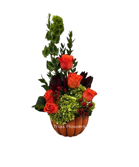 An arrangement of orange roses, green hydrangeas, safari sunset, red hypericums, bells of ireland in a pumkin ceramic vase