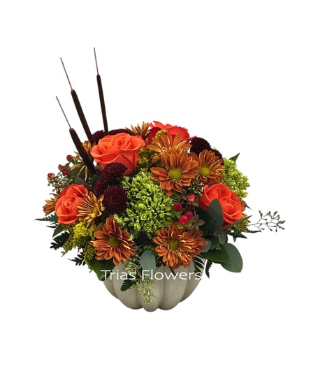 An arrangement of green hydrangeas, orange roses, bronze daisy, red hypericums, yellow solidagos in a white pumpkin ceramic vase