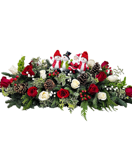 An arrangement of red roses, white roses, red hypericums, white faux cherries, bells of Ireland and wintergreens.