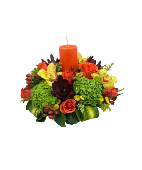 An arrangement of green hydrangeas, yellow cymbidium orchids, orange roses, safari sunset, red hypericum and yellow solidagos