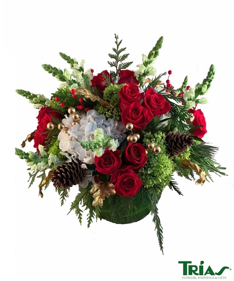 The Holiday Rouge arrangement from Trias Flowers in Miami, FL embodies festive elegance and is designed to elevate any setting it graces. This luxurious bouquet mixes classic holiday colors with golden sparkle, making it a perfect centerpiece for the season. The arrangement features deep red roses, symbolizing love and celebration, surrounded by the lush, subtle textures of mini green hydrangeas and crisp white snapdragons. The soft, voluminous blooms of white hydrangeas add a snowy contrast, evoking the feel of a winter wonderland.