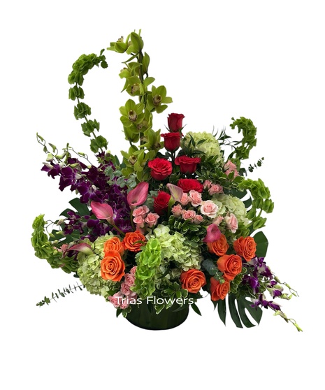 An arrangement of orange roses, hot pink roses, light pink spray roses, green cymbidium orchids, purple dendrobium orchids, green hydrangeas, pink mini callas, bells of ireland in a glass vase