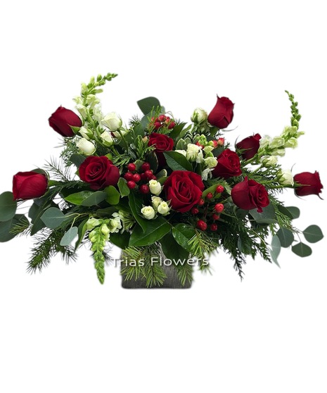 The Holiday in Style arrangement from Trias Flowers is a luxurious and festive creation that brings the magic of the holiday season to life. Featuring a rich combination of deep red roses, delicate white spray roses, and elegant white snapdragons, this arrangement blends classic beauty with contemporary style. Red hypericum berries add pops of vibrant color, perfectly complementing the lush greenery of fresh pine, which lends a warm and fragrant holiday touch. Arranged in a sleek silver ceramic vase, the Holiday in Style design exudes sophistication and elegance, making it an ideal centerpiece for festive gatherings or a thoughtful seasonal gift. The interplay of bold reds and soft whites creates a stunning contrast, while the silvery tones of the vase enhance its wintry charm.