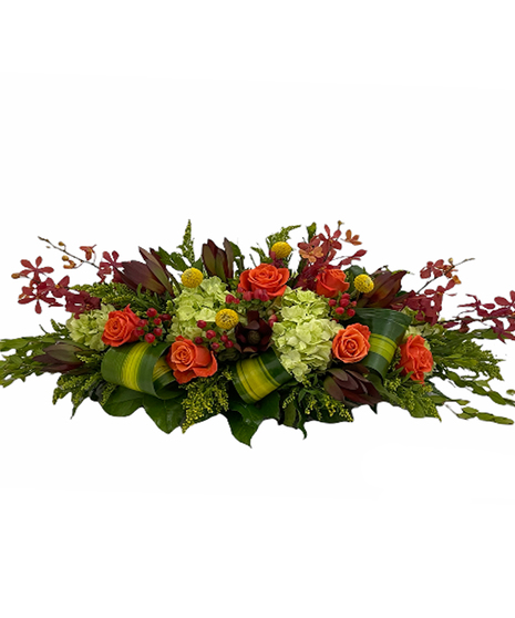 The "Simply Autumn" centerpiece from Trias Flowers in Miami, FL, beautifully captures the essence of the autumn season with its rich colors and diverse textures. This elongated centerpiece is meticulously crafted with red orchids, orange roses, and red hypericums, which blend harmoniously to evoke fall's warm, vibrant hues. Complementing these are the striking safari sunset and lush green hydrangeas, adding depth and contrast. The design is further enhanced by the inclusion of masangena leaves and yellow solidago, which not only provide a burst of color but also introduce a variety of textures that make the centerpiece come alive. Each element is thoughtfully placed to create a flowing, natural look that draws the eye along its length. It is an ideal adornment for long tables at gatherings, events or as a seasonal decoration in your home.