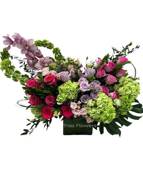An arrangement of pink cymbidium orchids, green hydrangeas, hot pink roses, pink roses, light lavender roses, light pink spray roses, white lisianthus, pink snapdragons, bells of ireland in glass vase