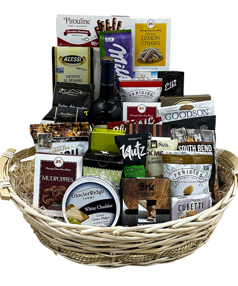 This Gourmet Basket Includes All The Favorites: peanuts, Cookies, Chocolates, Sausage, Ham, Pretzels, Caviar, Bottled Red or White Wine, and much, much more! It's a Perfect Gift For Anyone!